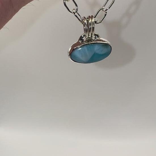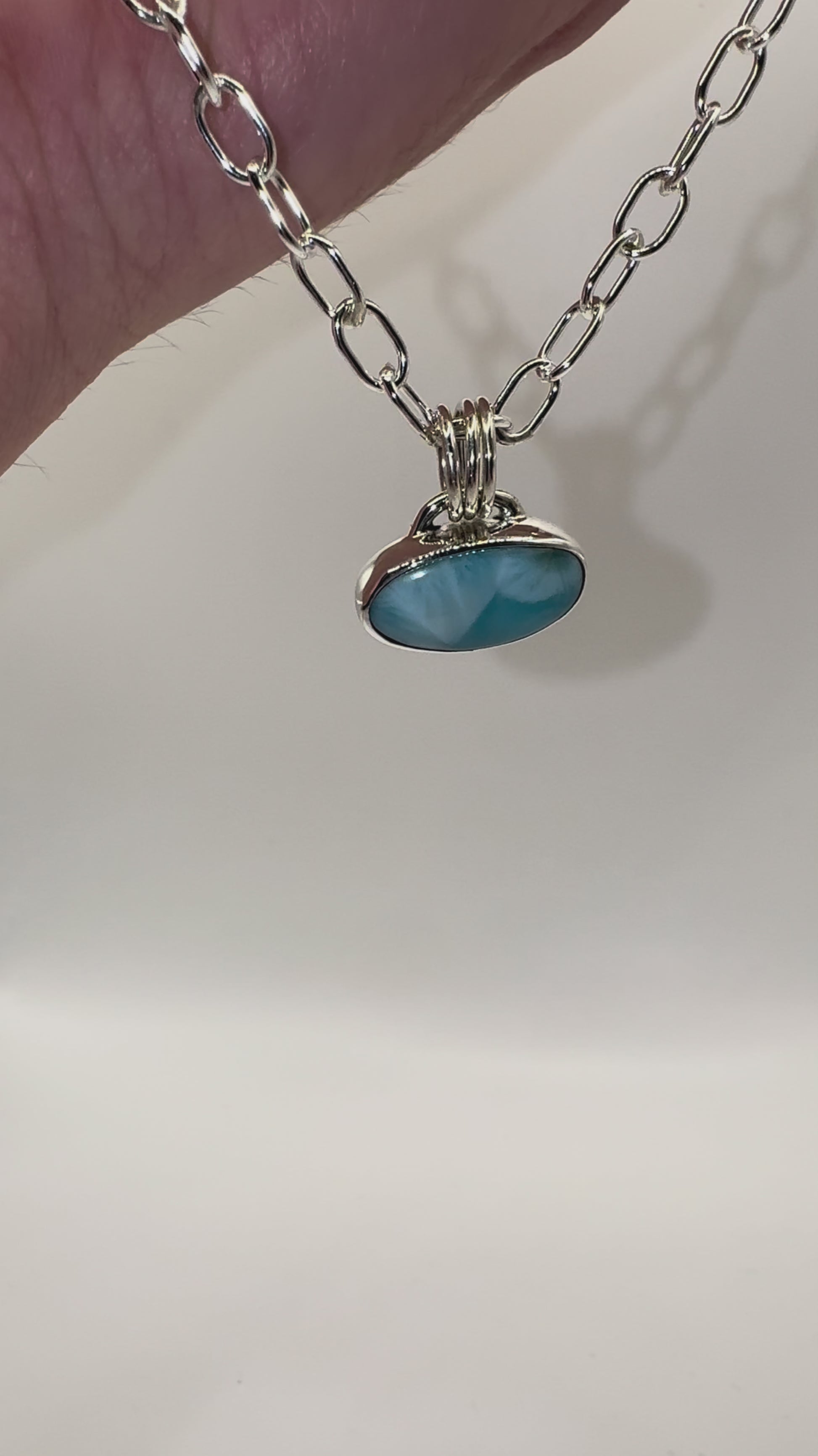 Natural larimar gemstone set in solid sterling silver. It's elegant and timeless making it the perfect piece for everyday wear.