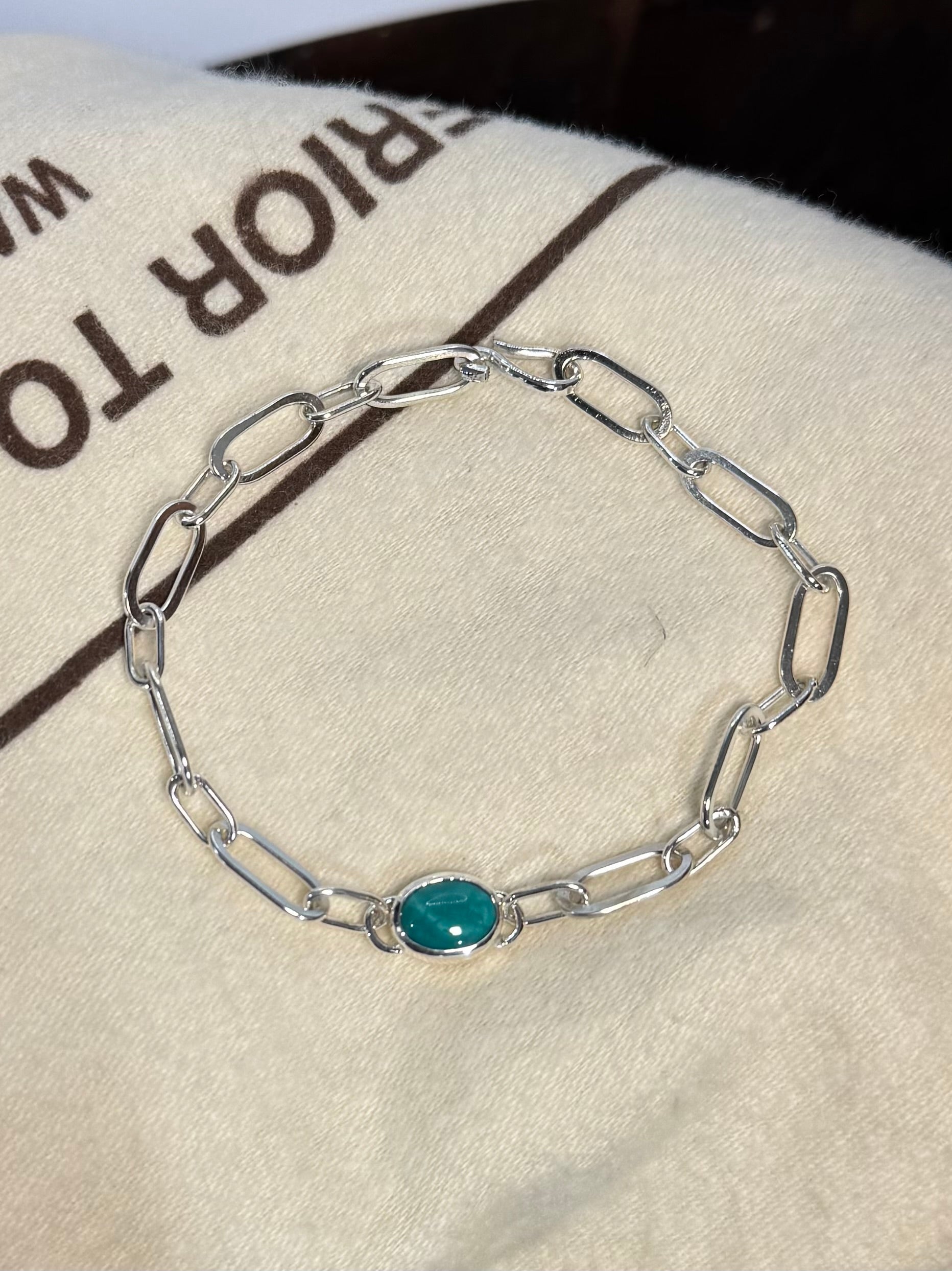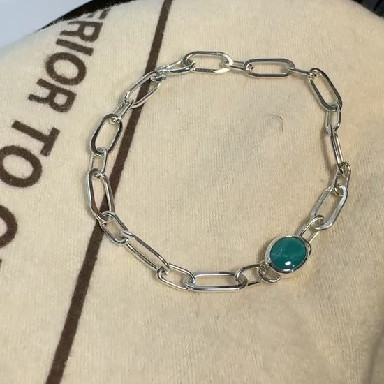 Vibrant Yungai Turquoise set in sterling silver and carried by a hammered paperclip chain.